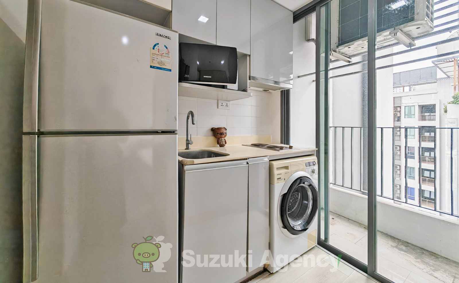 900世帯有る内の大半がスタジオタイプで、20平米弱とかなり小さなお部屋となります。ただ、キッチンエリアとベランダはしっかりあり、電気コンロと換気扇が標準でついているのは、素晴らしい限りです。室内に洗濯機収納スペースも有り、場合によっては、洗濯機も付いていることがございます。最上階とファシリティーフロアの一部が、メゾネットになっています。